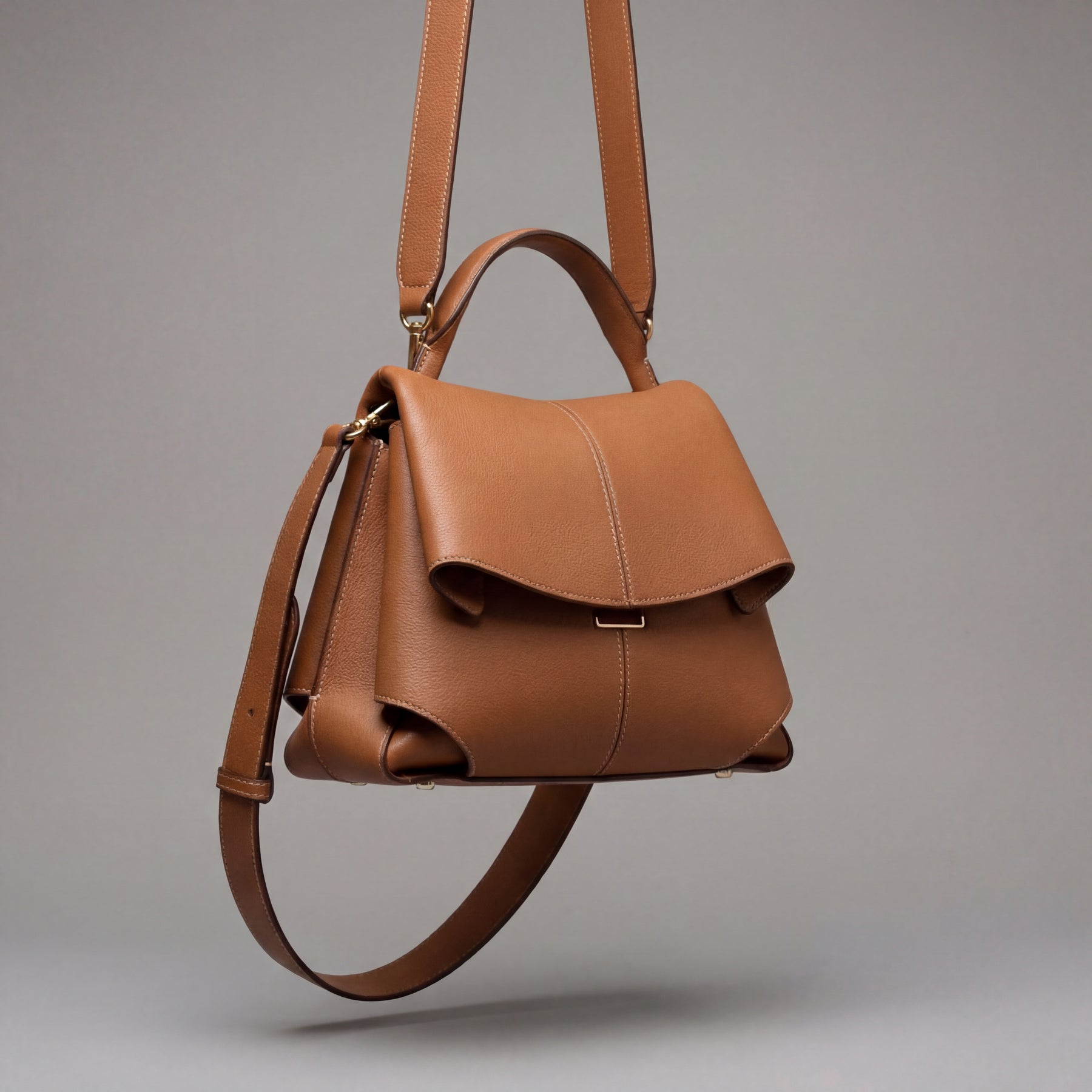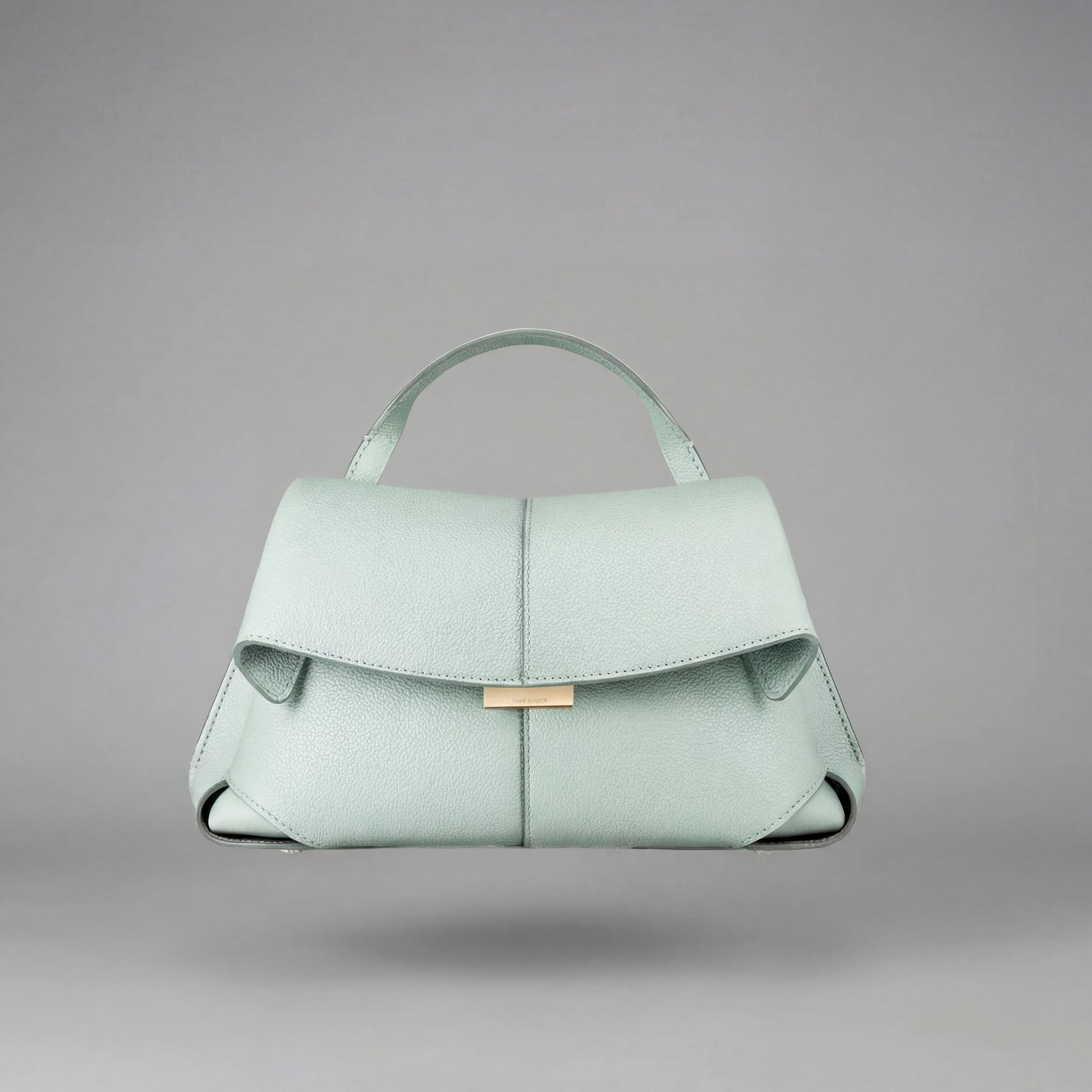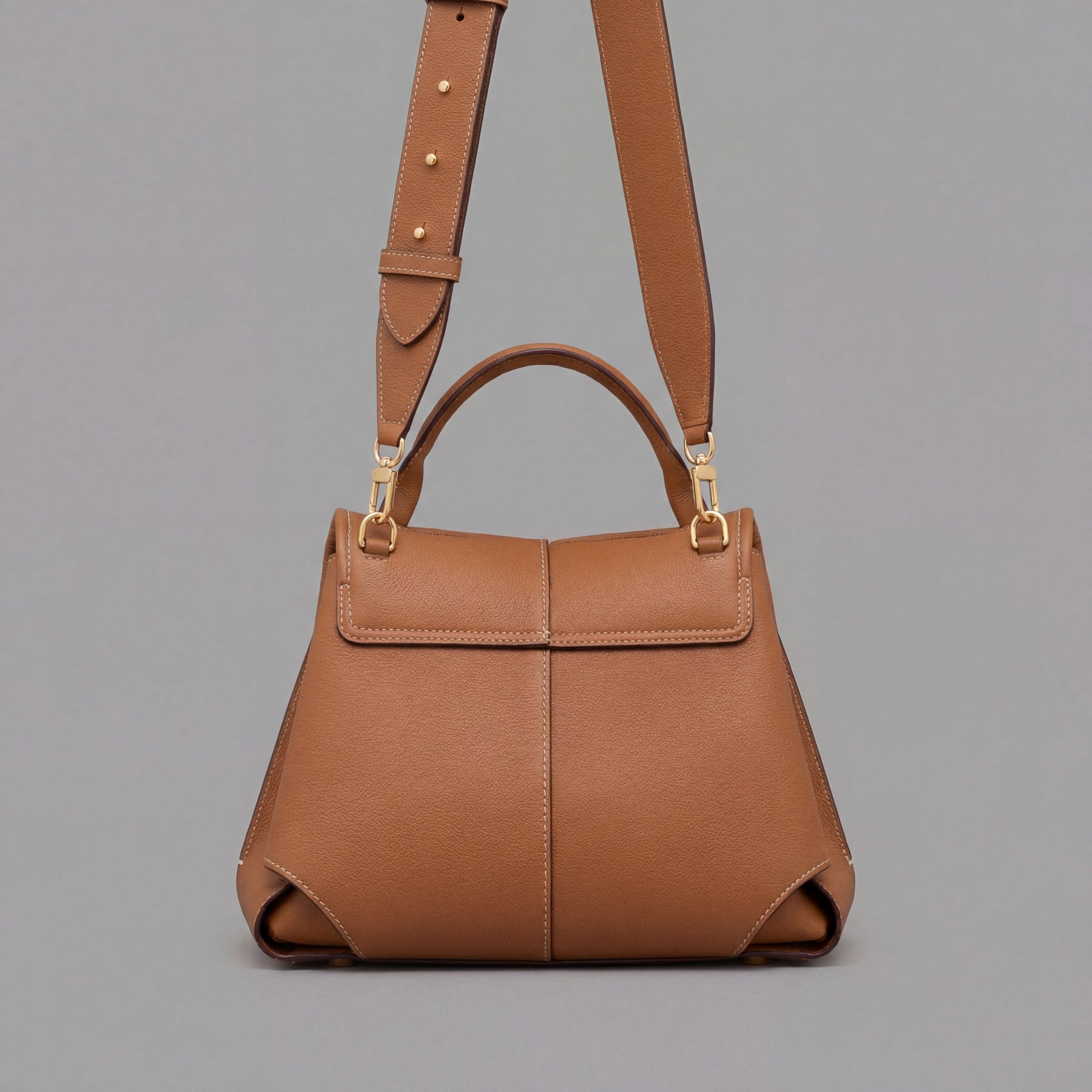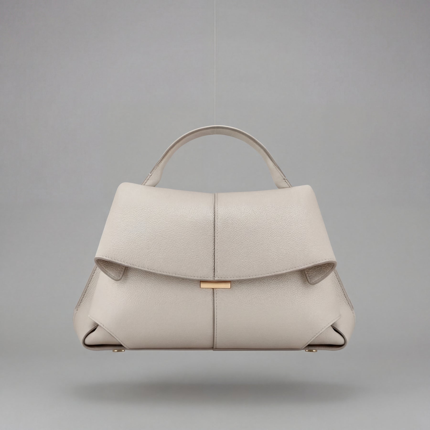 The clean stitching details and softly curved flap create a modern yet classic aesthetic. Its minimalist design makes it easy to pair with coats, dresses, or tailored outfits.