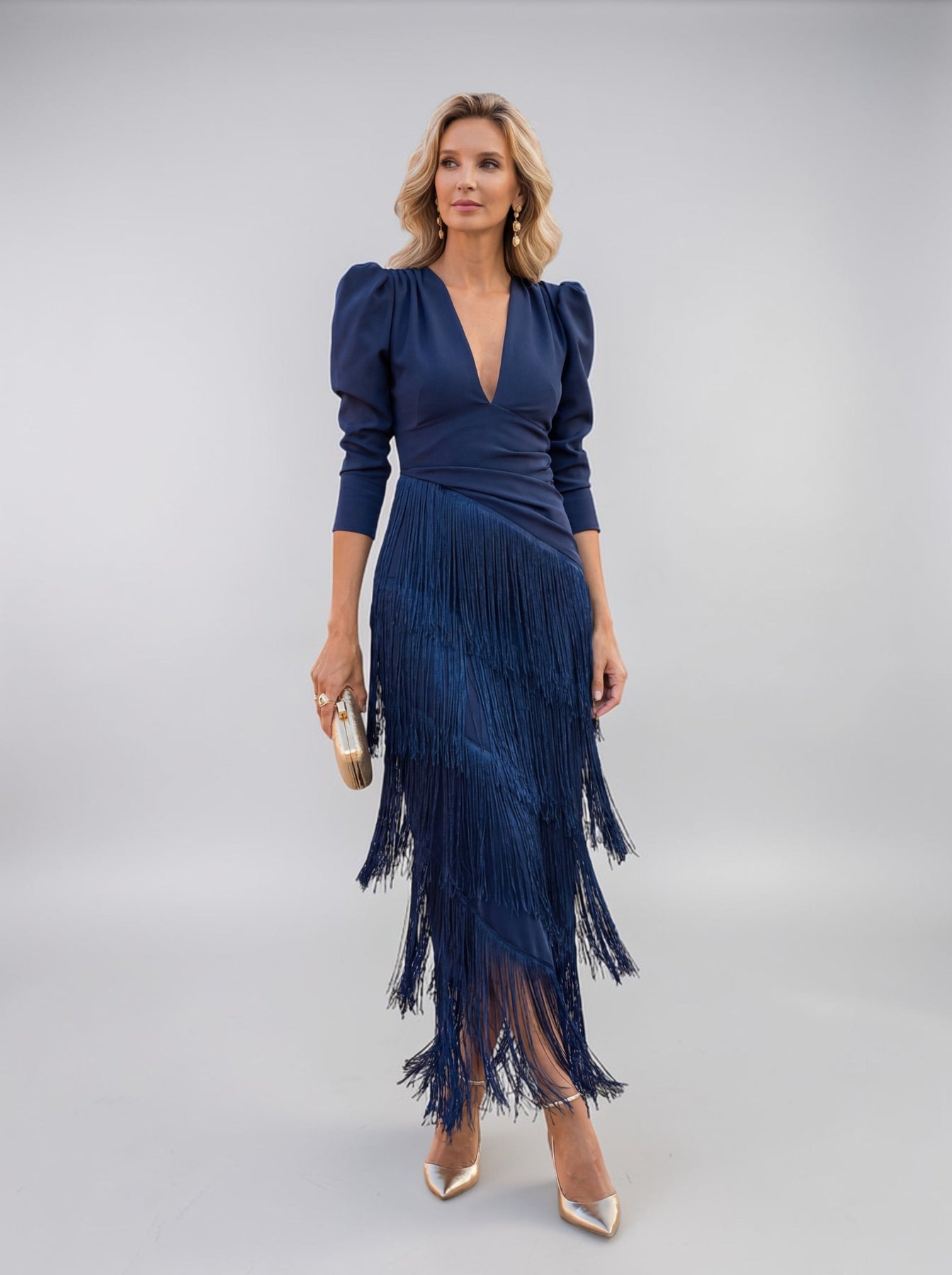 The V-neckline softly enhances the upper silhouette, while the fringe detail adds motion, texture, and a more luxurious sense of movement. Together, they create a dress that feels stylish, graceful, and beautifully expressive — perfect for women who want to feel elegant while still standing out in a refined way.